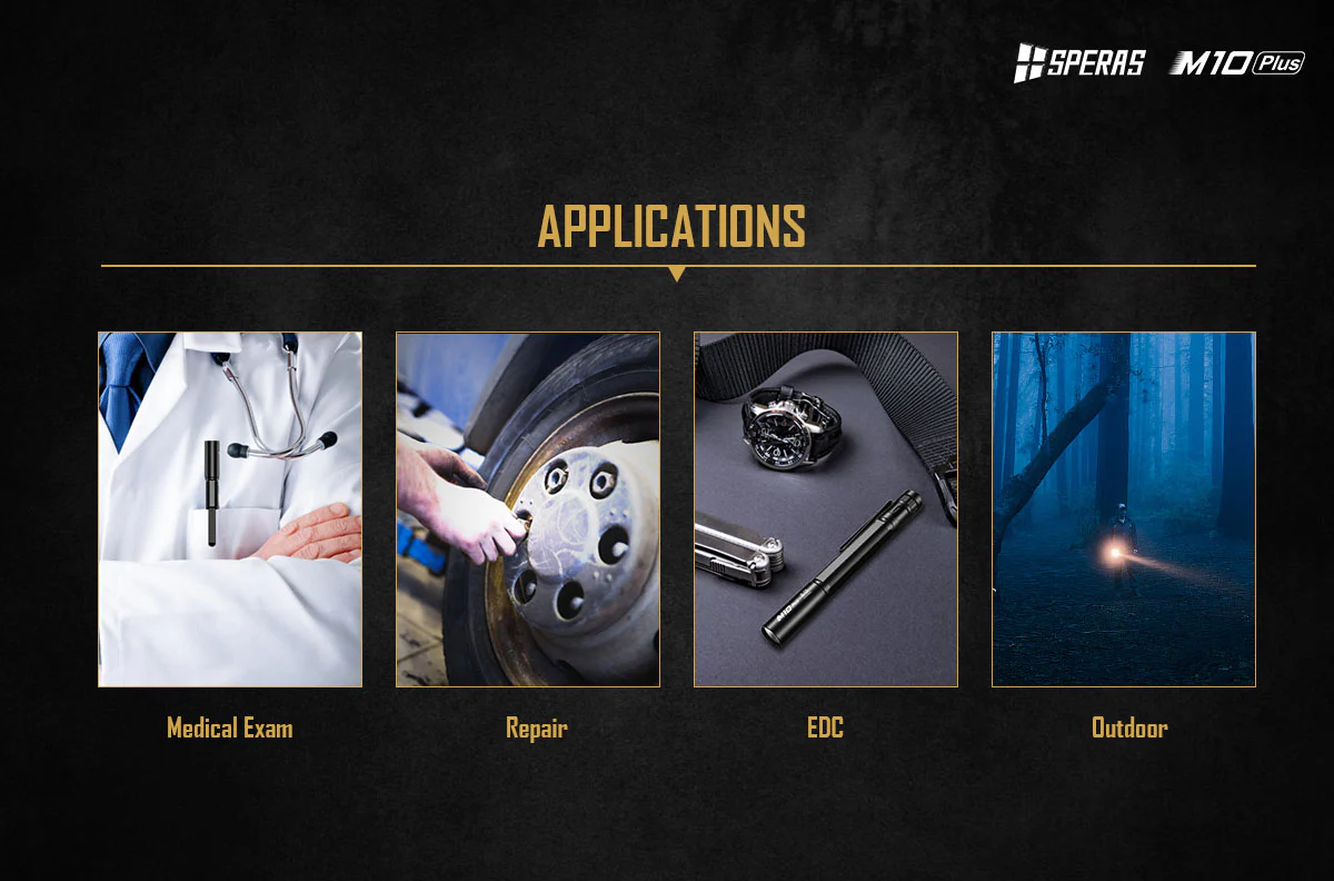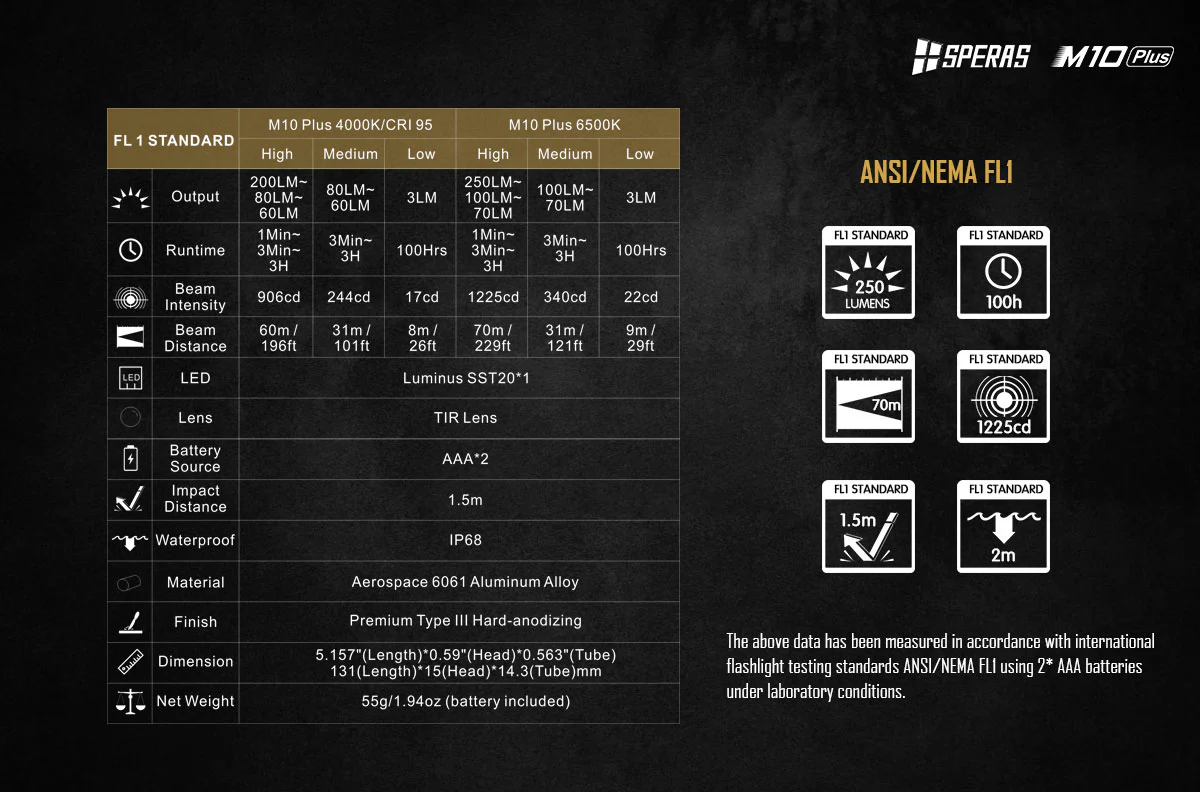 • Powered by AAA battery, M10 Plus have high performance of 250 lumens output.
